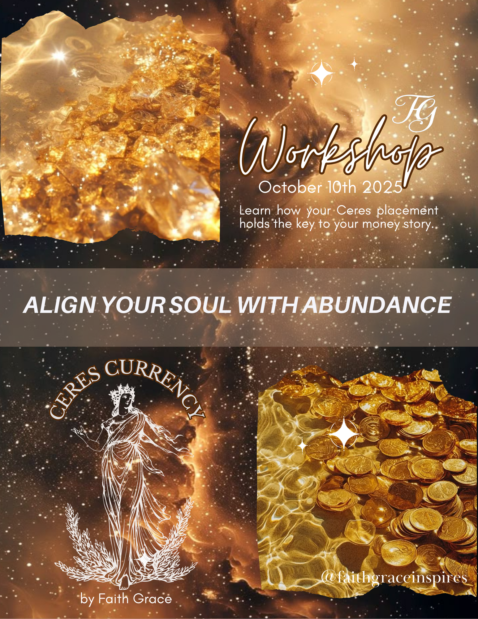 In Ceres Currency, you’ll uncover how Ceres’ placement in your birth chart reveals your unique money patterns and cycles of abundance. You’ll learn how to heal scarcity wounds, shift out of over-giving, and root into self-worth as a foundation for wealth. We’ll explore practical rituals and astrological techniques that help you align your finances with nurturing energy rather than fear. By the end of the workshop, you’ll walk away with tools to create sustainable abundance that feels grounded, intentional, and soul-aligned.